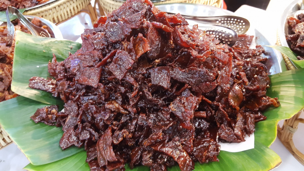 KaoNiewNueaKem est un boeuf salé frit sur du riz gluant. Le porc est frit avec du sel et de l'oignon rouge, servi avec du riz gluant normal ou du riz gluant noir.