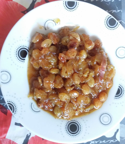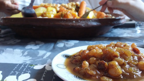 | Si vous avez l’habitude de déguster le #Couscous# traditionnel aux légumes et à la viande, celui-ci qui est plutôt sucré-salée va vous étonnez. Quand on parle de « Tfaya », on fait référence au confit d’oignons qui a été cuit avec des raisins secs, de la cannelle, du sucre ou du miel. Grâce à ce mélange, cette sauce a une saveur spéciale et une texture très agréable en bouche qui séduit tous ceux qui la goûte. Plat attitré pour les occasions ou l’on reçoit des invités à qui l’ont veut faire honneur, ce couscous est incontournable ! A la dégustation, il est plaisant de prendre des bouchées avec un peu de semoule, du confit et de la viande ou légumes selon les préférences de chacun. Très bon, le couscous aux raisins secs et oignons confits étonne quand on y goûte la première fois, l’effet sucré-salé prend de surprise avant de s’y accoutumer et y prendre plaisir comme en mangeant un #Couscous# seulement aux légumes.