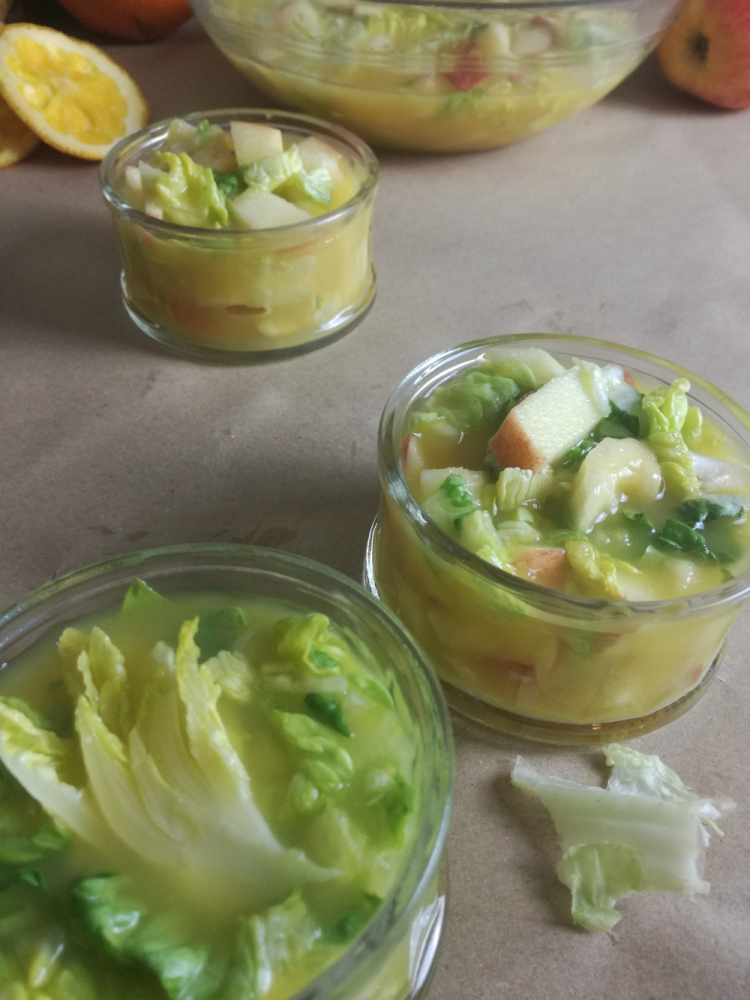 La salade verte (la Sucrine est la variété de salade la plus utilisée au Maroc) est nettoyée, coupée en petites lamelles puis généreusement arrosée de jus d’orange sucré et de fleurs d'oranger.