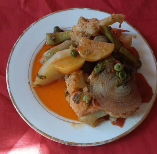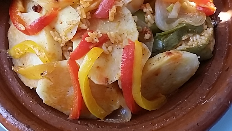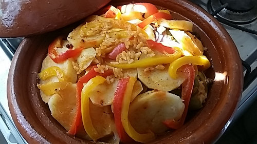 | Le tout sera assaisonné de sel, poivre et paprika. Puis généreusement arrosé d'huile d'olive. La cuisson lente garantie des légumes fondants et savoureux.Le goût peut être relevé grâce au persil ou autres herbes telle que la coriandre. Vous avez bien compris que la Khardoula est simplement un tajine de légumes dont la composition est libre à chacun.